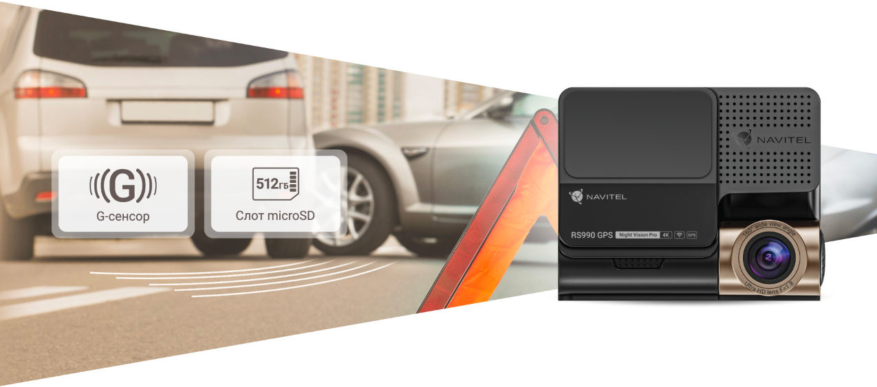Видеорегистратор NAVITEL RS990 GPS имеет встроенный датчик удара (G-сенсор), который защищает от перезаписи видео, сделанное в нештатных ситуациях. В случае резкого маневра или удара по автомобилю, система сохраняет видеофрагмент события в защищенную папку на карте памяти. Датчик сработает даже в том случае, если зажигание автомобиля выключено. Режим парковки* в видеорегистраторе позволяет записывать события во время короткой или долгой стоянки, когда вас нет в салоне, и автомобиль заглушен.