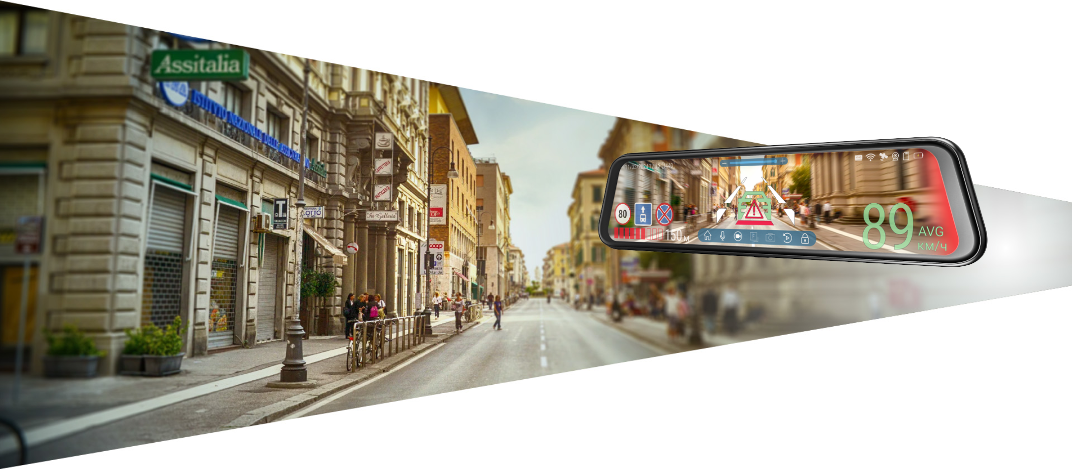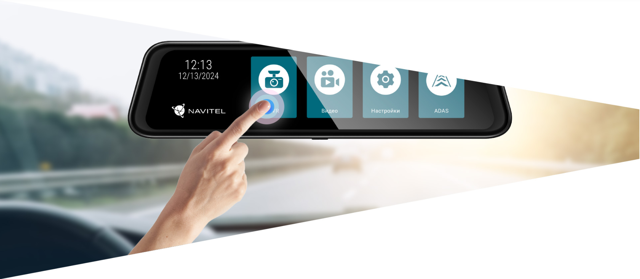 Инновационный ёмкостный сенсорный дисплей диагональю 11.9 дюйма занимает почти всю поверхность зеркала. Просмотр записей, настройка параметров и переключение между режимами работы устройства стали комфортными, как никогда раньше.